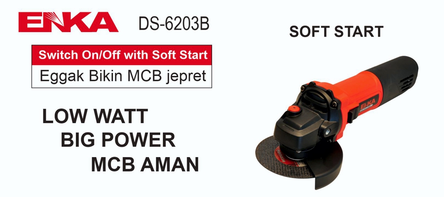 ENKA DS-6203B is a high powered angle grinder with little electric consumption. The highest current that it can produce is at 8A which is on par with 1600Watt in its full use and the lowest is at 1.5A which is similar to 330Watt when idle. The soft starter feature prevents the circuit breaker from going down and the machine’s RPM from jolting. The machine’s construction is based on a very simple design and is easy to maintain and safe to use. The 200C thermal class copper layer that covers its’ motor and its impact-resistant plastic body enables it to operate longer in workshop/professional environments. This machine also performs with high stability and comfort.