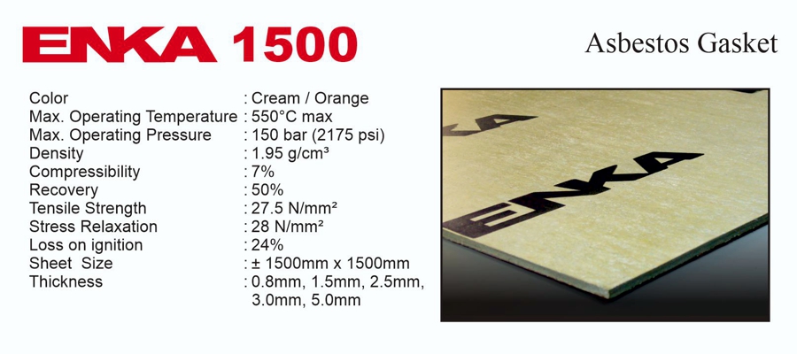 ENKA 1500 is manufactured from selected quality asbestos fibre with special rubber compound. Suitable for application in a modern industry such as against dry and wet steam, water, gases, alkalies oil (at normal temperatures), chemicals, fuels, and general engineering.