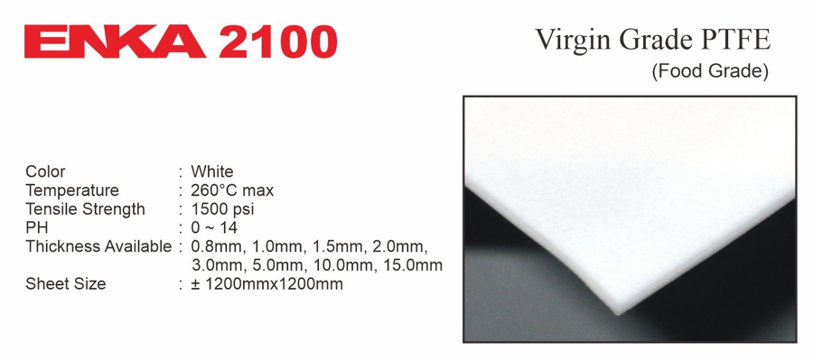 ENKA 2100 is made of 100% Virgin PTFE to provide excellent seal ability. ENKA 2100 has non sticking surface and low frictional characteristic. Recommended for use in general sealing or gasket applications. It has pH of 0 ~ 14, and resistant to most of chemicals, and acid.