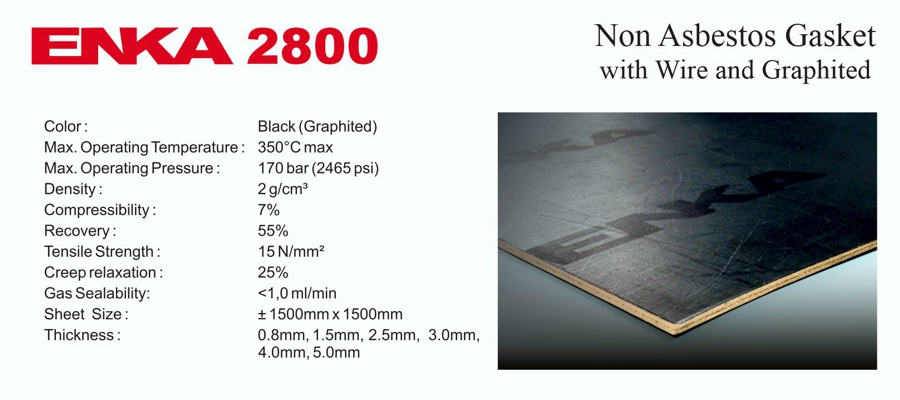 ENKA 2800 is a non asbestos gasket based on Aramid fiber and organic fiber with NBR binder and steel wire reinforced. It has excellent thermal, chemical & mechanical properties. Enka 2800 is suitable for internal combustion engines and alkalis for high stress conditions.