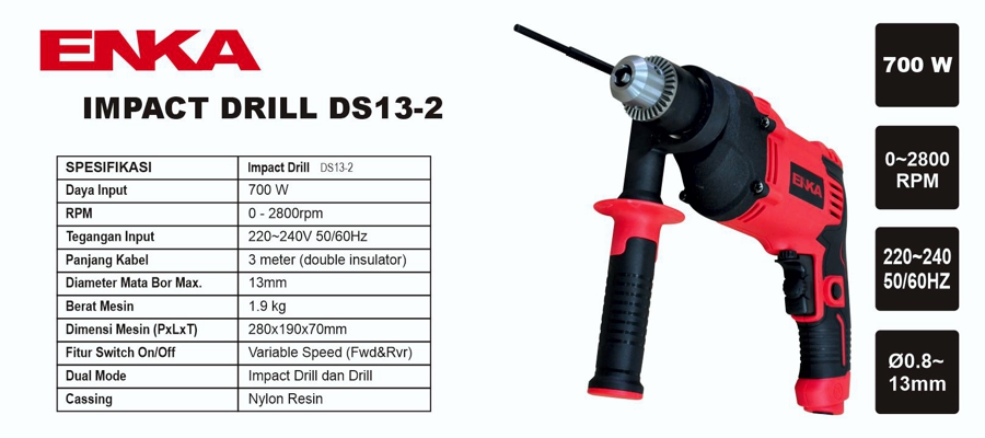 ENKA IMPACT DRILL DS13-2 is a handheld drilling machine consisting of 3 drilling applications such as metal, wood and masonry drilling. The On/Off button is equipped with variable speed function, enabling the drilling machine to operate on a wider range of applications including polishing, bolt fastening, etc. The impact function of this drilling machine allows it to function as a hammer to break down concrete. This machine uses the best Chuck and operates on a high level of precision which guarantees a more centred spin and keeps the drill bit more durable and less breakable.