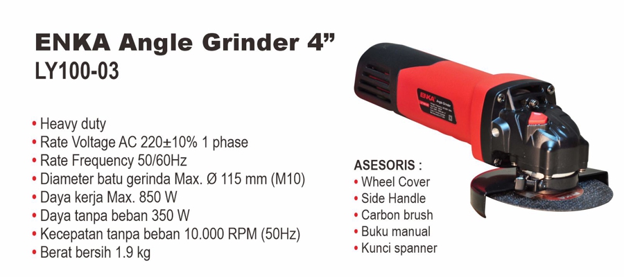 ENKA LY100-03 is a high-powered angle grinder machine. ENKA LY100-03 makes effective and efficient angle grinding possible. This machine construction is based on a very simple design, makes it easy to maintain and safe to use for a long period of time. A thermal 200degree Celcius copper layer that covers the motor and its impact resistant plastic and nylon body enable it to operate for a long period of time in workshop/professional and even industrial environments. This machine also performs with high stability and comfort.