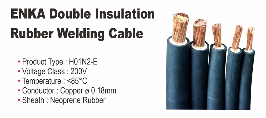 Enka Rubber Welding Cable menggunakan isian tembaga yang diplintir dengan rasio strand 1.02, dilapisi/diisolasi dengan karet sintetis EPDM berwarna hitam dan putih. Enka Rubber Welding Cable mudah diaplikasikan, tidak gampang mekar, mudah dimasukan ke dalam skun, tersedia dalam ukuran 16mm² (panjang 100 meter spool kayu), 25mm² (panjang 100 meter spool kayu) 35mm² (panjang 100 meter spool kayu), 50mm² (panjang 50meter spool kayu dan 100 meter roll tanpa spool), 70mm² (panjang 50 meter spool kayu dan 100 meter roll tanpa spool)